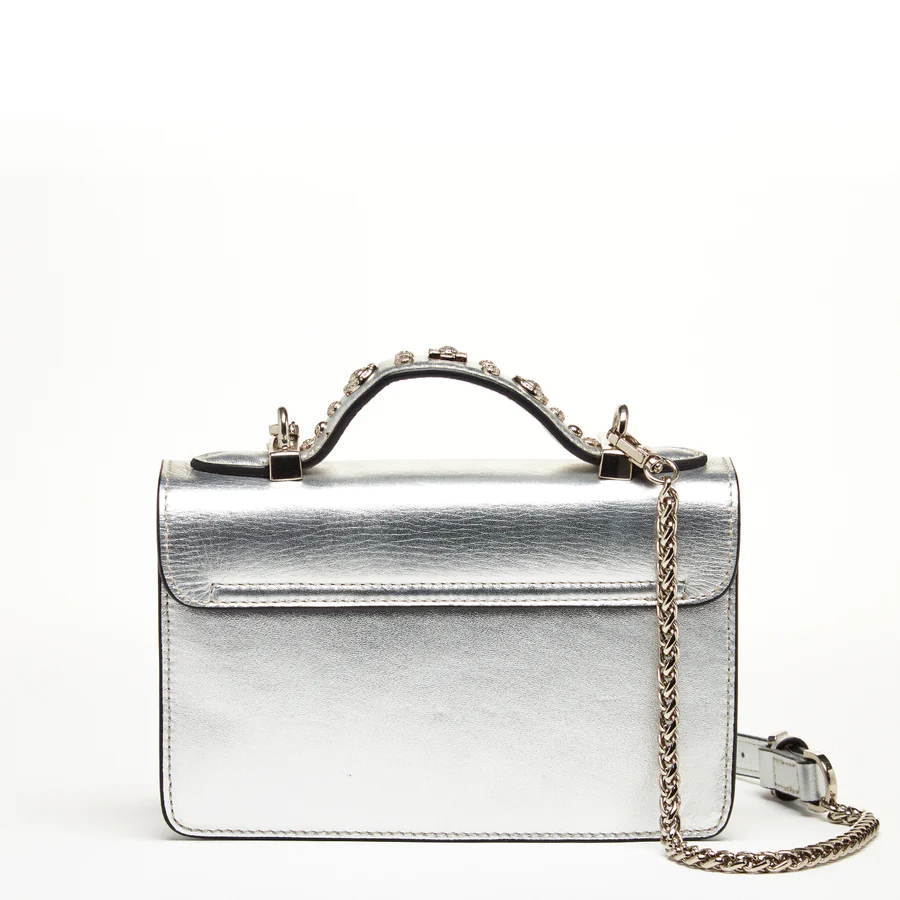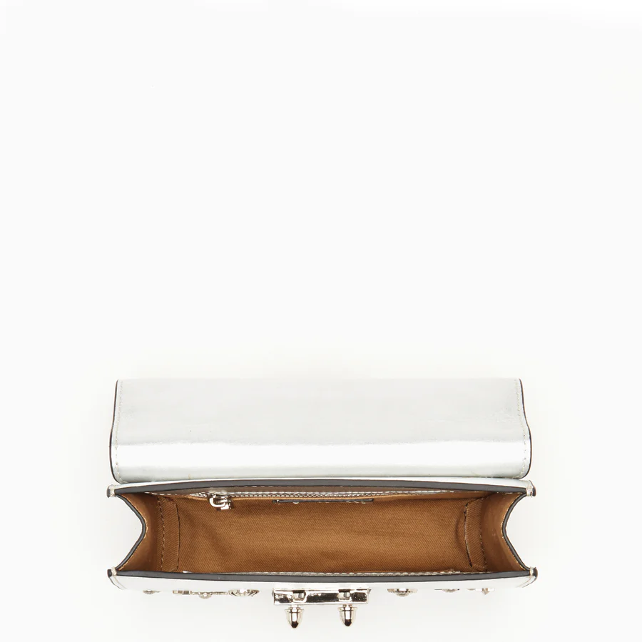This studded silver leather crossbody bag is the perfect accessory to elevate your style. The high-quality leather construction and silver studs add a touch of glamour and edge to the sleek and stylish design. The adjustable chain link strap allows for comfortable wear as a crossbody, and thefully lined interior can hold your phone and other essentials. The silver hardware gives the purse a luxury touch, making it perfect for both casual and dressy occasions. Whether running errands or hitting the town, thissmall leather purse will add a touch of sophistication to any outfit. It's an amazing evening bag, great for attending a party, wedding and a date night.