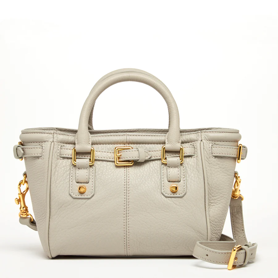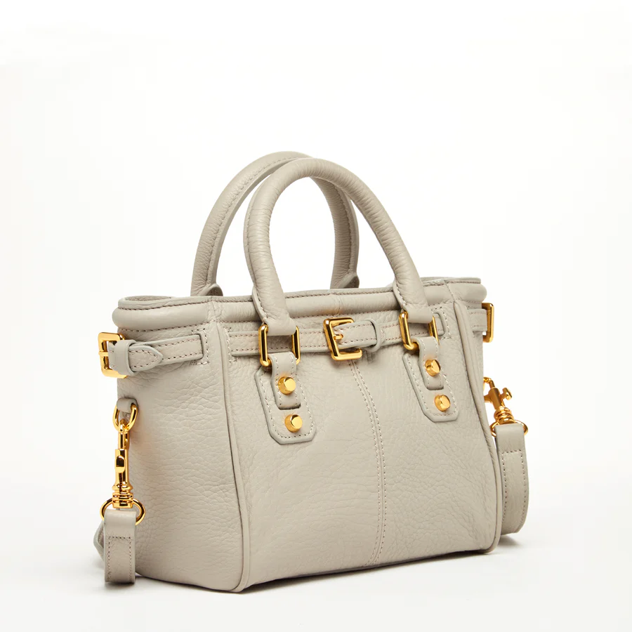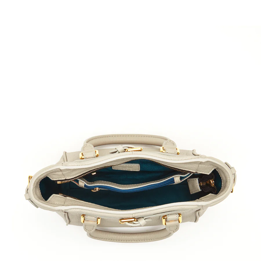 Introducing our stylish and versatile grey beige leather satchel bag with top handles. Made from premium quality leather, this bag is both durable and elegant. The beige color adds a touch of sophistication to any outfit. The bag features a spacious main compartment with multiple pockets and compartments to keep your belongings organized. The adjustable shoulder strap ensures a comfortable fit, making it the perfect companion for work, travel, or everyday use. The leather satchel bag is a perfect accessory to complete your look, whether you're dressing up or down. The classic and timeless design will never go out of style, making it a great investment piece. Upgrade your accessory game with this beige leather satchel bag today!